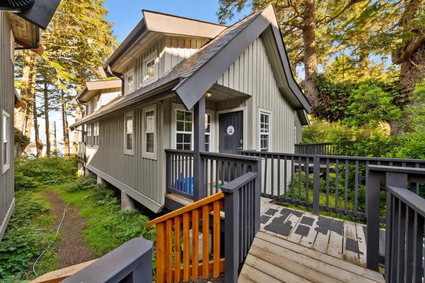 Located near the end of the secluded Ucluelet peninsula on Terrace Beach. Nicknamed “Ukee” by the locals, a hidden gem just 30 minutes drive from the world famous year-round surfer’s paradise of Tofino, Ucluelet has grown into a popular travel destination on its own. The vibe: a quiet, laid-back pacific northwest surf town with towering old growth trees, abundant wildlife, and unmatched ocean views around every corner. Take time to check out the unique shops, restaurants, cafes, breweries and distilleries minutes away from your cabin. You can also rent bikes or surfboards/paddleboards/kayaks, hop on a whale watching tour, visit the aquarium, and venture out on several epic hiking trails. Nestled in the temperate pacific rainforest, the cabin looks out to the open ocean and connects directly to the famous Wild Pacific Trail right at your doorstep. You won’t find this anywhere else!